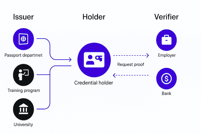 Verifiable Credentials (VCs): A tamper-resistant data format used to express signed statements from an issuer (e.g. “Degree: Computer Science” or “Bank account verified”). These credentials allow for secure and extensible certification of information.