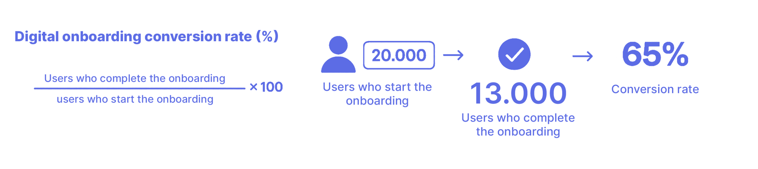 Digital onboarding conversion rate (%) = (Users who complete the onboarding ÷ Users who start the onboarding) × 100