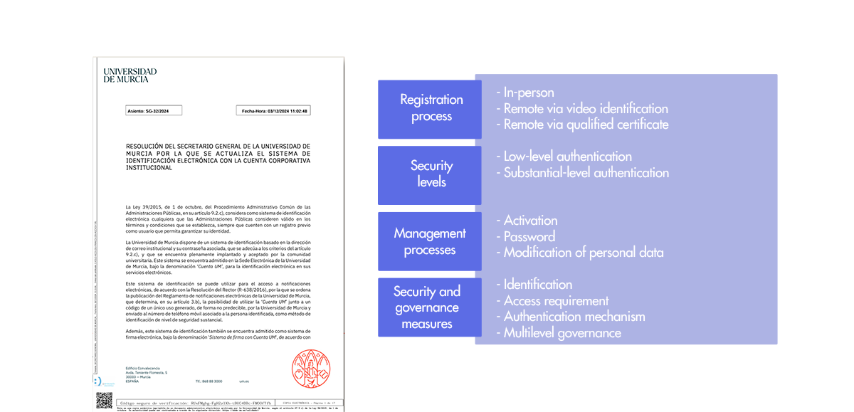 One of the major milestones that enabled the implementation of the digital onboarding project at the University of Murcia was the update of the internal regulations governing the university’s electronic identification system. Until then, identification processes were limited to in-person methods and did not include remote mechanisms, which posed an obstacle to advancing the digitalization of university services.