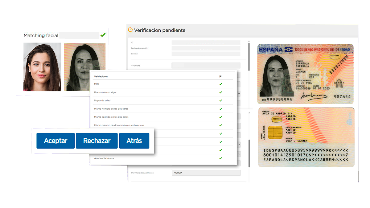 - Validation of national and international identity documents (DNI, NIE, passport).