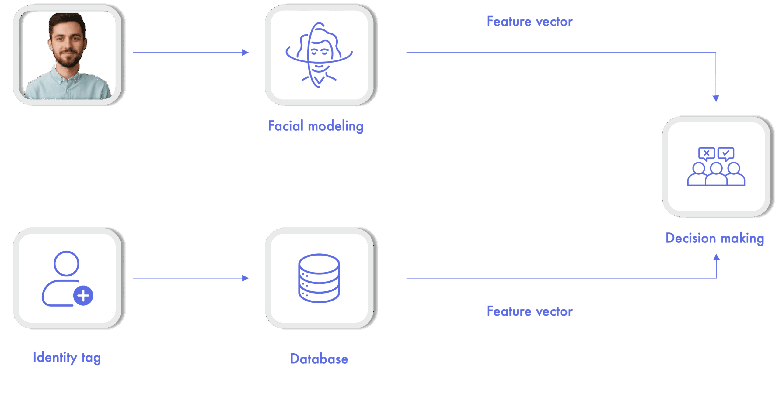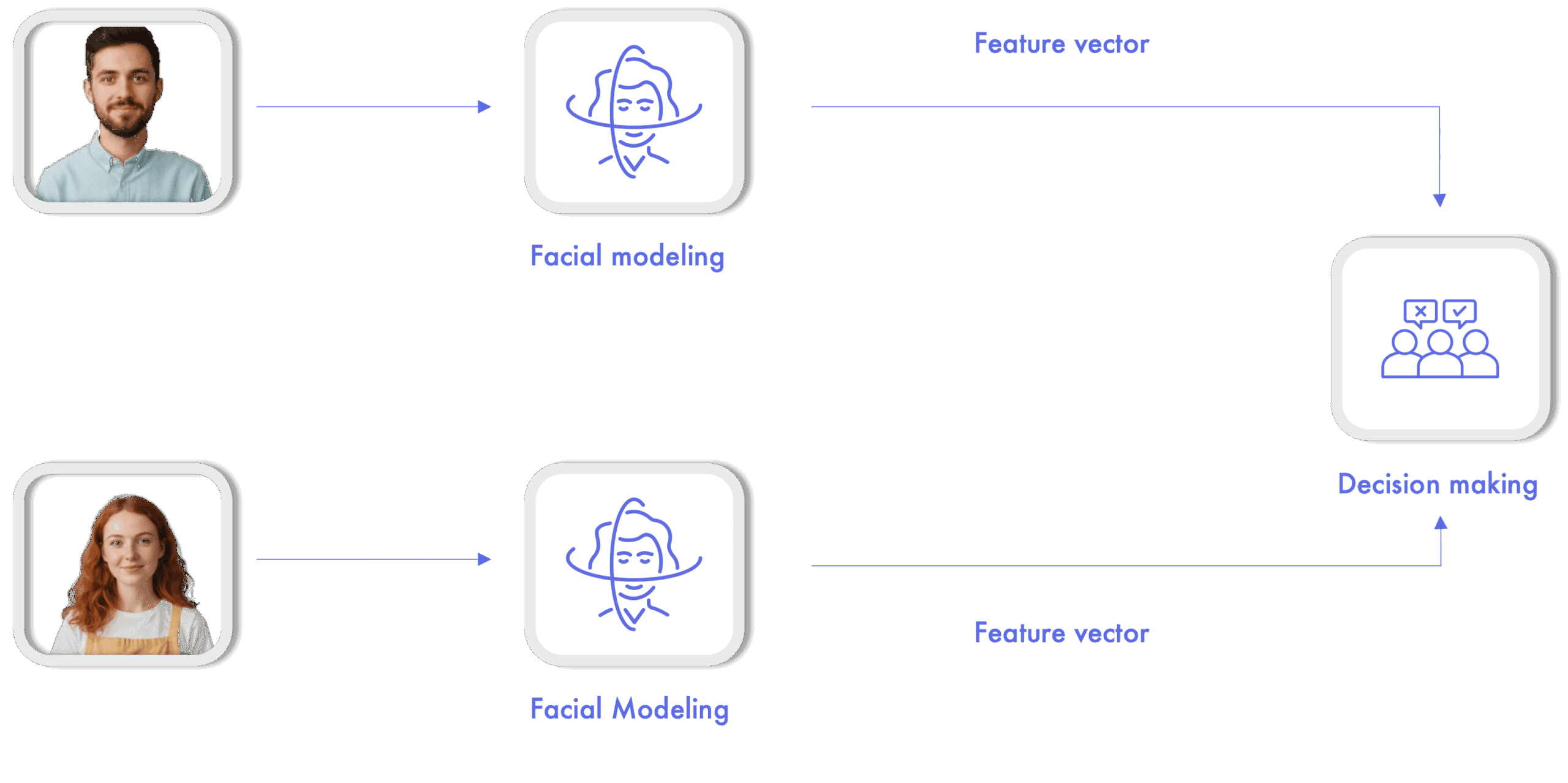 - Matching: are they the same person? Given two input images, the objective is to determine the match between them. A common use of this operation is in remote customer registration systems, where the image of an identity document is compared with an image taken from the user during the registration process.